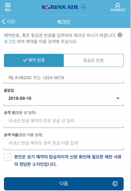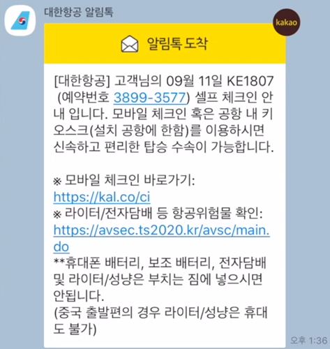 비행기 예약하면 카톡(알림톡)으로 정보가 오는데 대한항공 링크를 클릭하여 모바일 체크인 시작합니다.