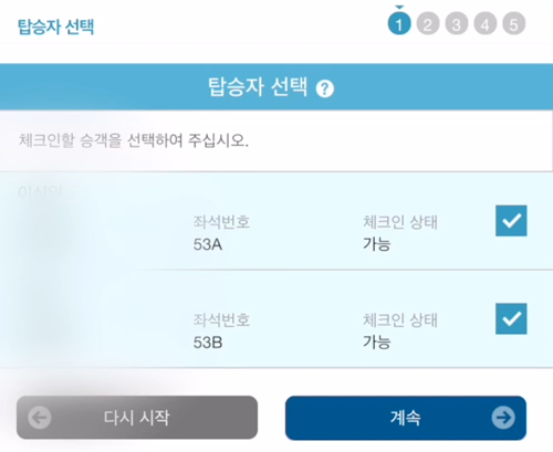 탑승자 정보 이름 오른쪽에 체크인 상태를 가능으로 체크합니다. 그리고 아래에 계속 버튼을 클릭하세요.