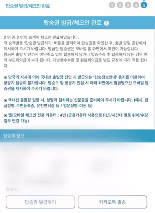 여기까지 진행하셨다면 탑승권 발급 및 체크인이 완료되었습니다.