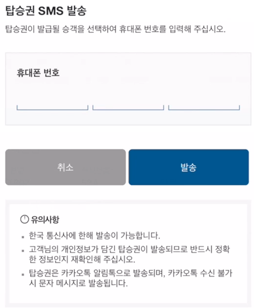 카카오톡으로 발송을 누르면 항공편 정보를 받을 수 있는데요. 탑승자가 각각 발송 버튼을 따로 눌러주셔야 합니다.