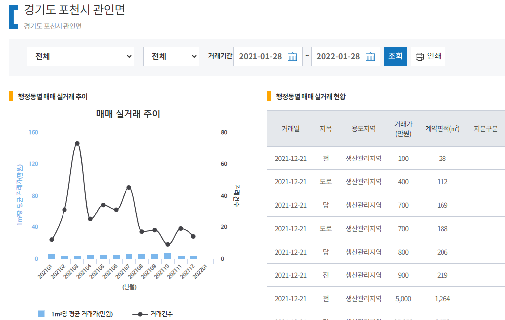 경기도 포천시 관인면에선 2021년 12월 21일에 전 28 제곱미터가 평당 100만원으로 거래되었었네요.