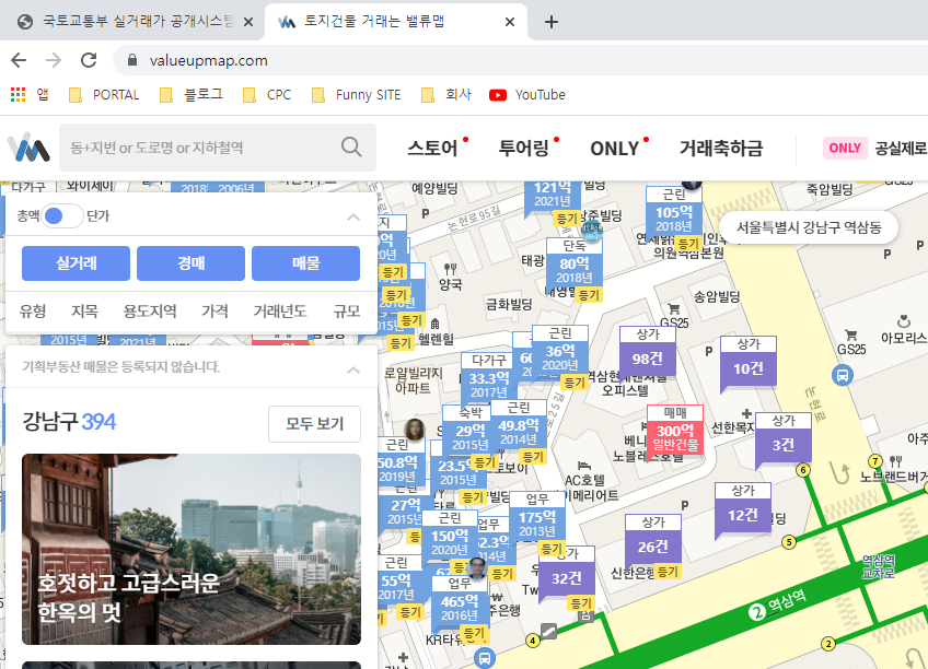 밸류맵이라는 토지 실거래가 조회 사이트인데요. 핸드폰 어플로도 확인을 할 수가 있습니다.