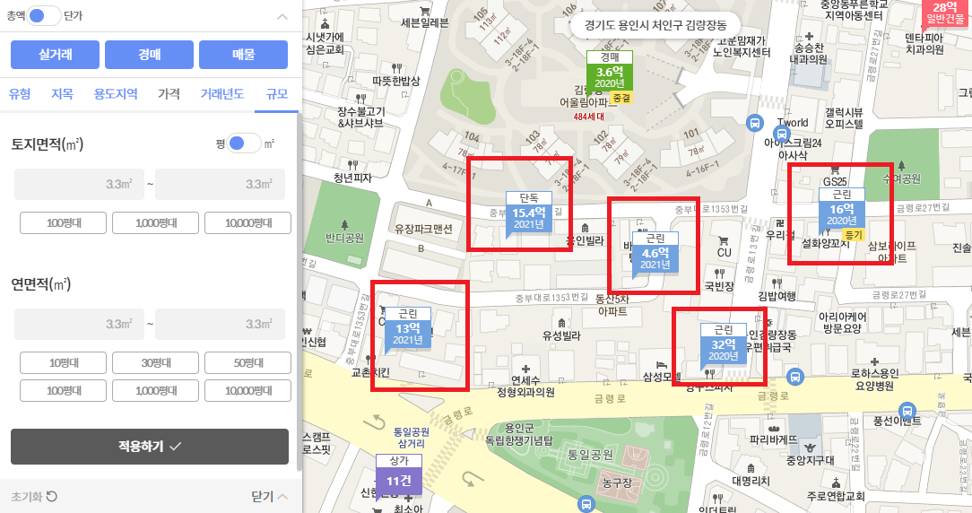 실제로 밸류맵 같은 경우는 감정평가사가 일에 편리함을 위해서 직접 만든 사이트라고 합니다. 밸류맵으로 부동산 유형, 지목, 용도지역, 가격 등으로 필터를 걸어서 토지 실거래가 조회할 수가 있습니다.